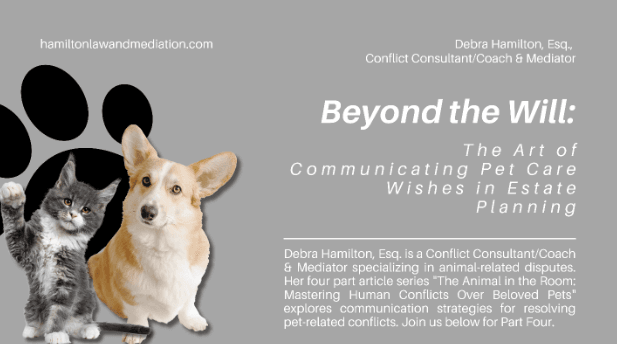 Debra Hamilton, Esq., Conflict Consultant/Coach, Mediation Navigating divorce, pet custody, veterinary disputes, breeder conflicts, and neighbor disagreements with clarity and purpose Animal-related conflicts are unlike any other disputes. When your...